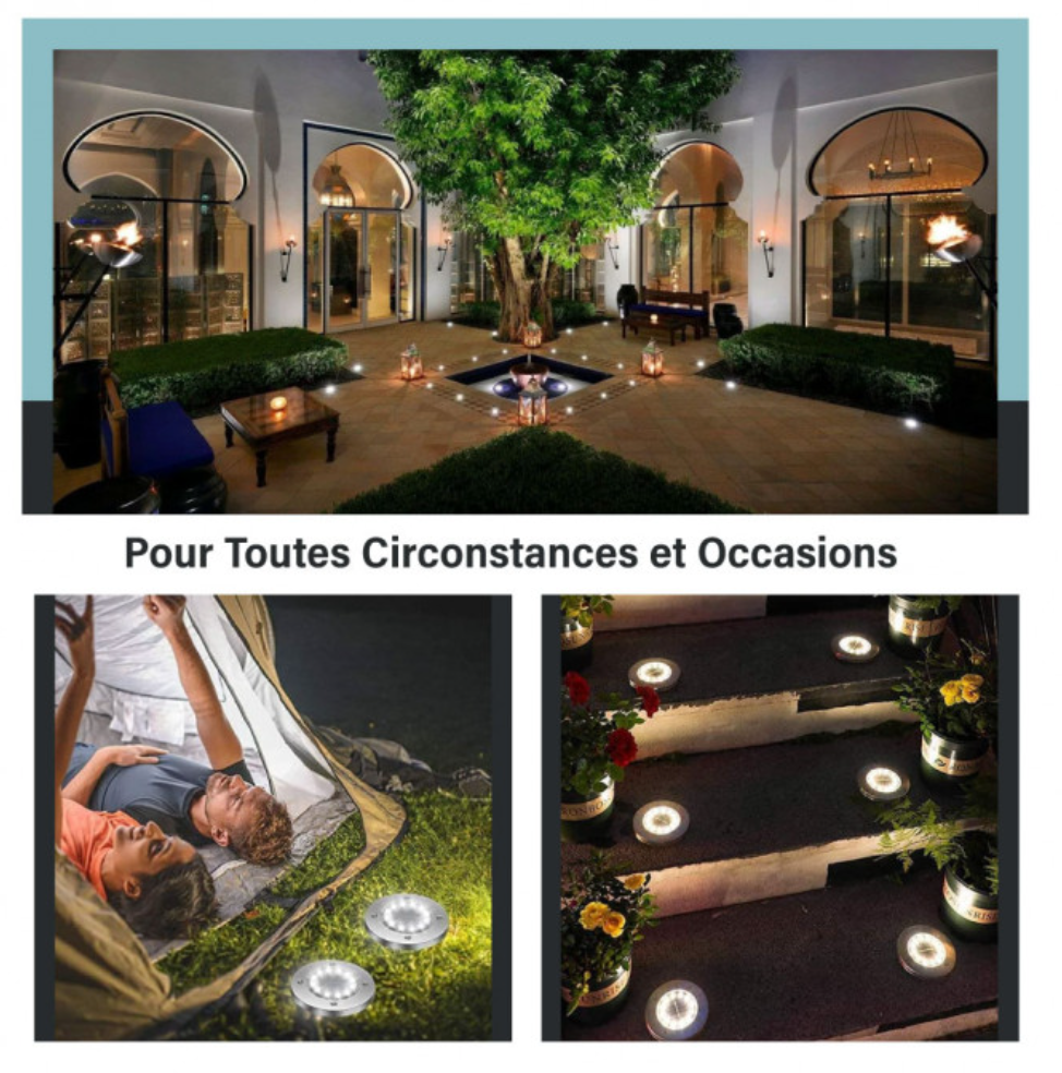 Les lampe solaire jardin au sol sont étanches IP65, fabriquées en acier inoxydable et ABS de haute qualité pour une utilisation en extérieur, résistantes à la corrosion et durables. Parfait pour pelouse, terrasse, jardin, balcon, parc, rue, passerelle. Ne vous inquiétez pas de la pluie, de la neige, du brouillard, du gel.